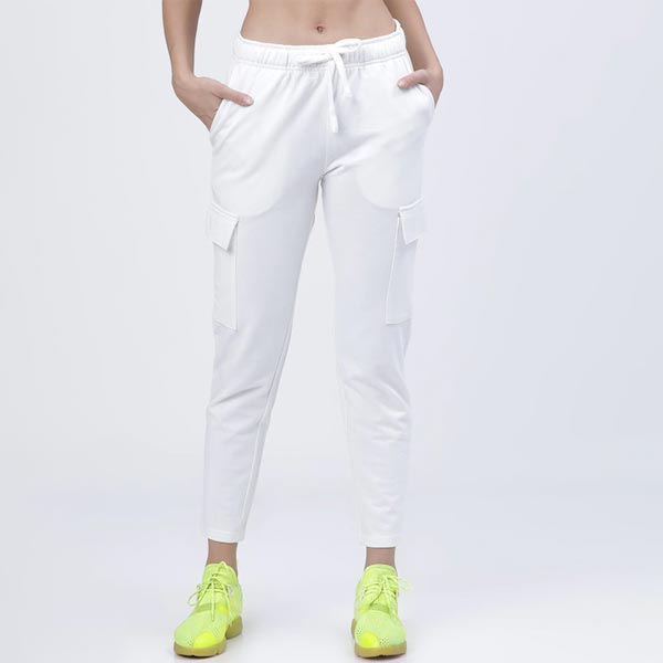 White solid slim-fit cargo track pants, has an elasticated waistband with drawstring closure, 2 flap pockets and 2 side pockets